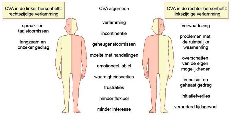 Er gebeurd erg veel na een CVA in het lichaam. De gevolgen hiervan zijn op veel gebied te merken. Hierboven hebben wij ze gerangschikt op somatisch gebied, cognitief gebied, psychisch gebied en sociaal gebied. Ook hebben wij een ervaringsverhaal toegevoegd.